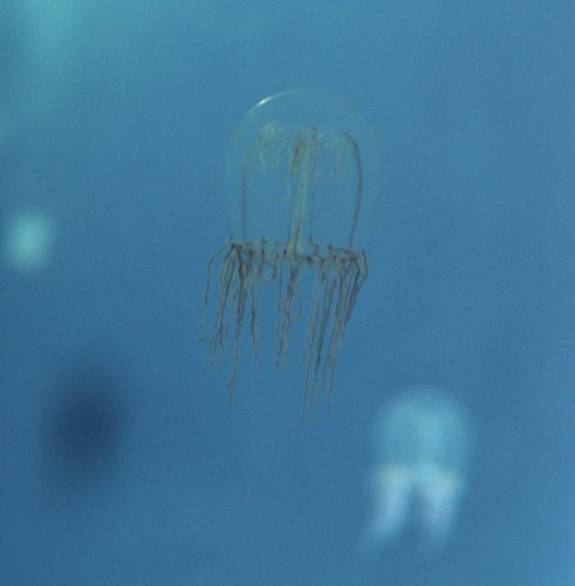 The aquarium has a large display of jellyfish.